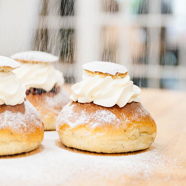 Semla: tradycyjny słodki wypiek wypiekany w Szwecji z okazji tzw. fettisdag, czyli "tłustego wtorku". Na kardamonowej bułeczce, z pastą z solonych prażonych migdałów, prażonymi migdałami i bitą śmietaną, oprószona cukrem pudrem, wersja przełamana konfiturą jeżynową. UWAGA: ODBIÓR SEMLI OD GODZINY 10