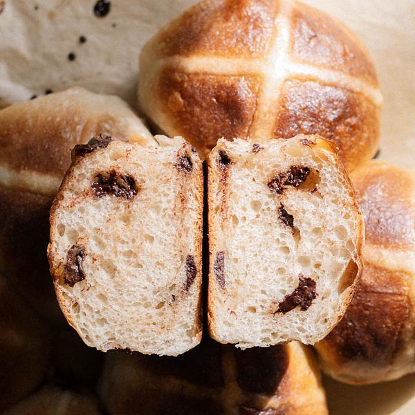 Tradycyjne bułeczki wielkanocne hot cross buns – w zaczynowym wydaniu na zakwasie! Wersja z ciemną belgijską czekoladą i aromatyczną bergamotką. Uwaga: do odbioru po godzinie 9!