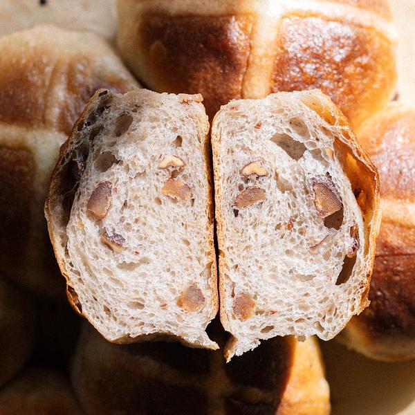 Tradycyjne bułeczki wielkanocne hot cross buns – w zaczynowym wydaniu na zakwasie! Wersja z orzechami pekan i syropem klonowym. Uwaga: do odbioru po godzinie 9!