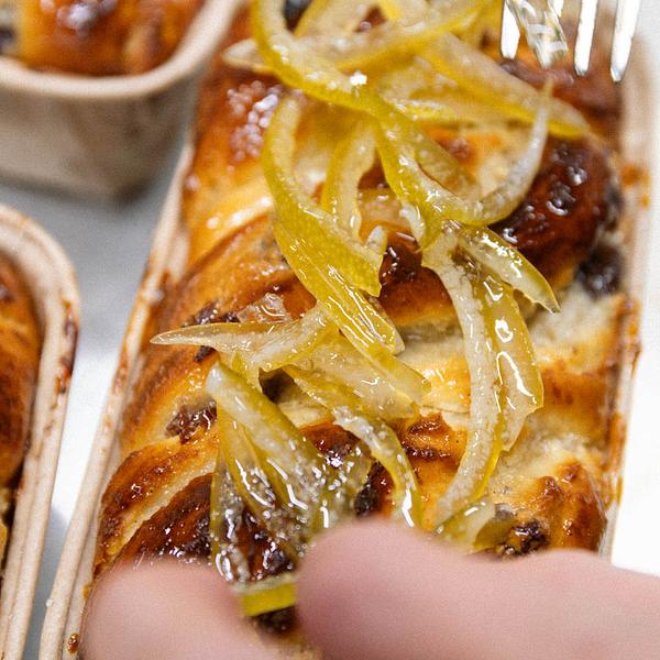 Nasz klasyczny już wypiek świąteczny: miękkie ciasto drożdżowe splecione z waniliowym twarożkiem z nerkowców i rodzynkami; po wypieczeniu oblane syropem i przyozdobione kandyzowaną przez nas skórką cytrynową; waga: 370g.