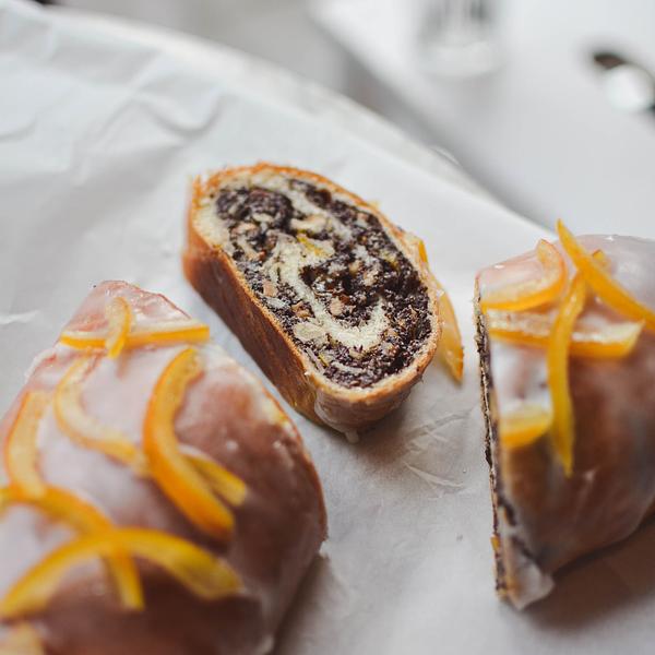 Zawijany makowiec drożdżowy wypełniony masą makową z bakaliami, ciemnym rumem, polany lukrem i wykończony kandyzowaną skórką z bio pomarańczy. Waga: ok. 900g; skład: ciasto drożdżowe (mąka pszenna typ 450, mleko sojowe, bio cukier trzcinowy, cukier biały, bio olej kokosowy, olej rzepakowy, drożdże świeże), nadzienie (mak niebieski, bio migdały, płatki migdałowe, orzechy laskowe, orzechy włoskie, bio śliwki suszone, bio rodzynki sułtanki w ciemnym rumie, suszone figi, kandyzowana skórka z bio pomarańczy, wanilia bourbon, mleko sojowe, bio syrop z agawy, bio olej kokosowy, białko ziemniaka), lukier (cukier puder, woda).