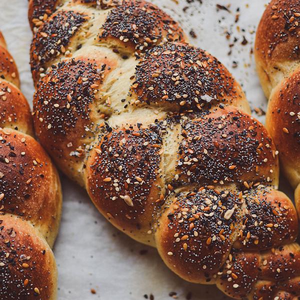 Chałka wytrawna z mąką z samopszy, ziarnami i solą maldon, wersja większa. Skład: mąka pszenna* typ 450, BIO mąka razowa z samopszy* typ 2000, napój sojowy* niesłodzony, gniecione ziemniaki, BIO cukier trzcinowy, cukier biały, olej rzepakowy, świeże drożdże, suszone drożdże, BIO ziarna sezamu*; ziarna czarnego sezamu, siemię lniane, sól Maldon, ok. 460 g. Alergeny oznaczone gwiazdką.